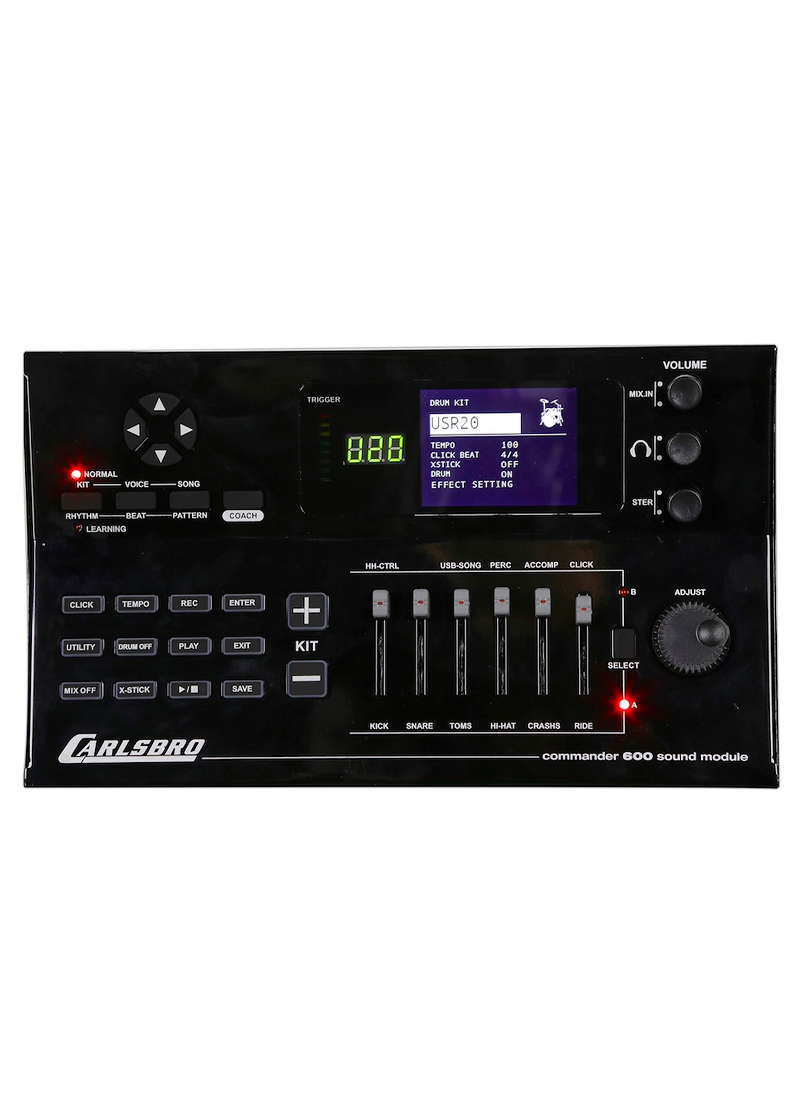 El módulo de sonido Commander 600 cuenta con una pantalla LCD de 2,8″, 20 kits de batería definidos por el usuario, 30 kits de batería predefinidos, 408 voces de percusión de alta calidad 20 canciones de demostración, función de coaching y aprendizaje, numerosos ajustes de reverberación, ecualizador, filtro y ajustes de afinación.