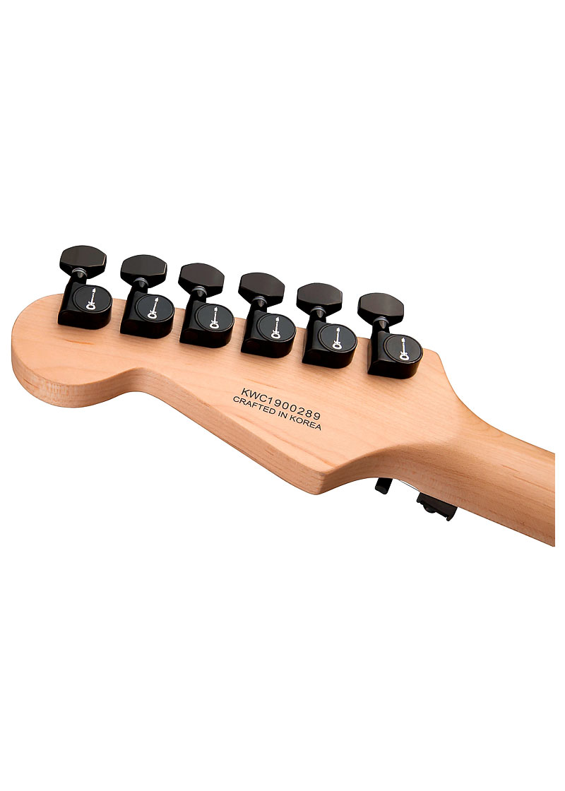 Su diapasón de ébano de radio compuesto de 12″-16″ alberga 22 trastes jumbo e incrustaciones de puntos blancos, y tiene una rueda de alma montada en el talón para ajustes rápidos y convenientes.