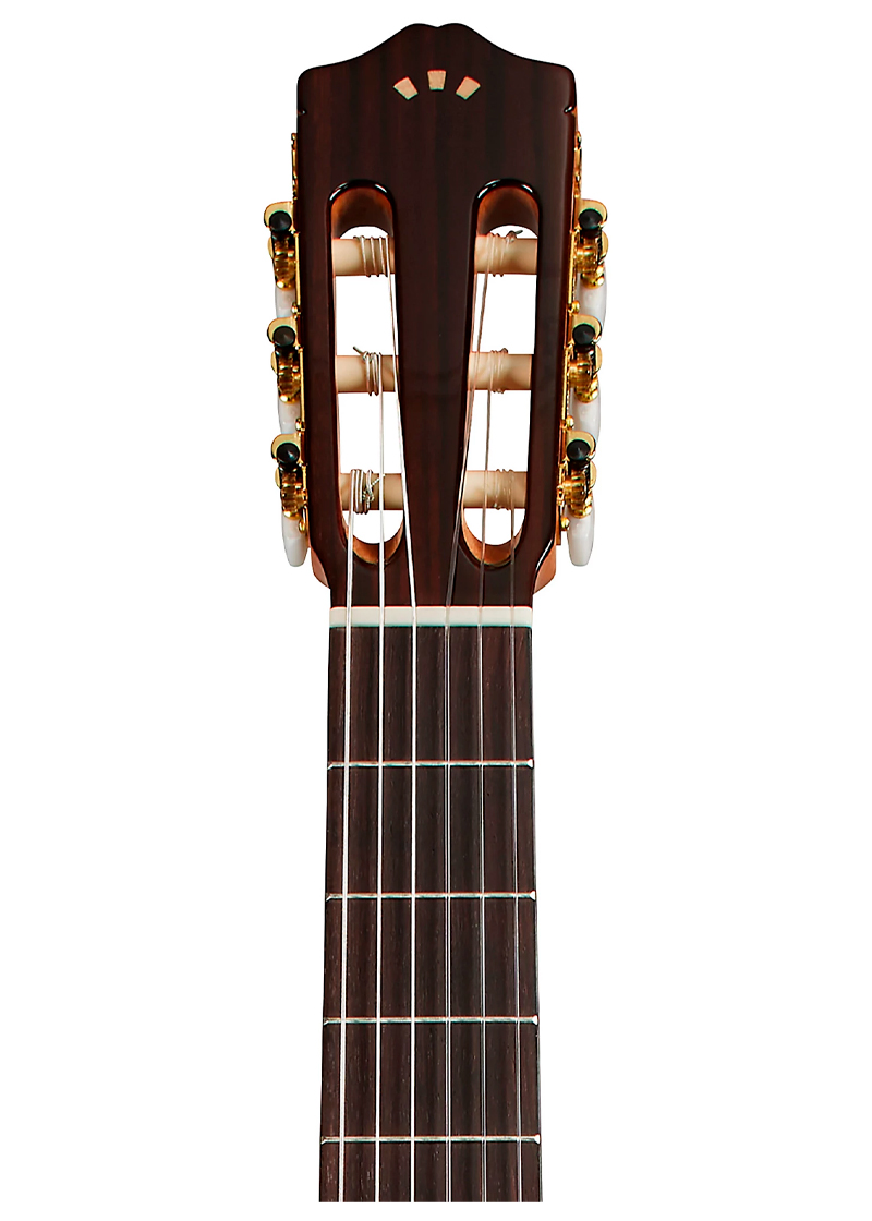 Hecha a mano en el estilo tradicional español, la C5 también cuenta con una roseta con incrustaciones de madera, cabezal tallado a mano.