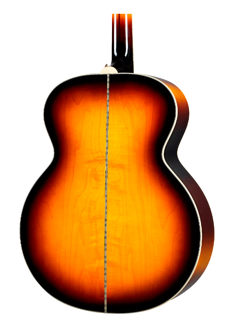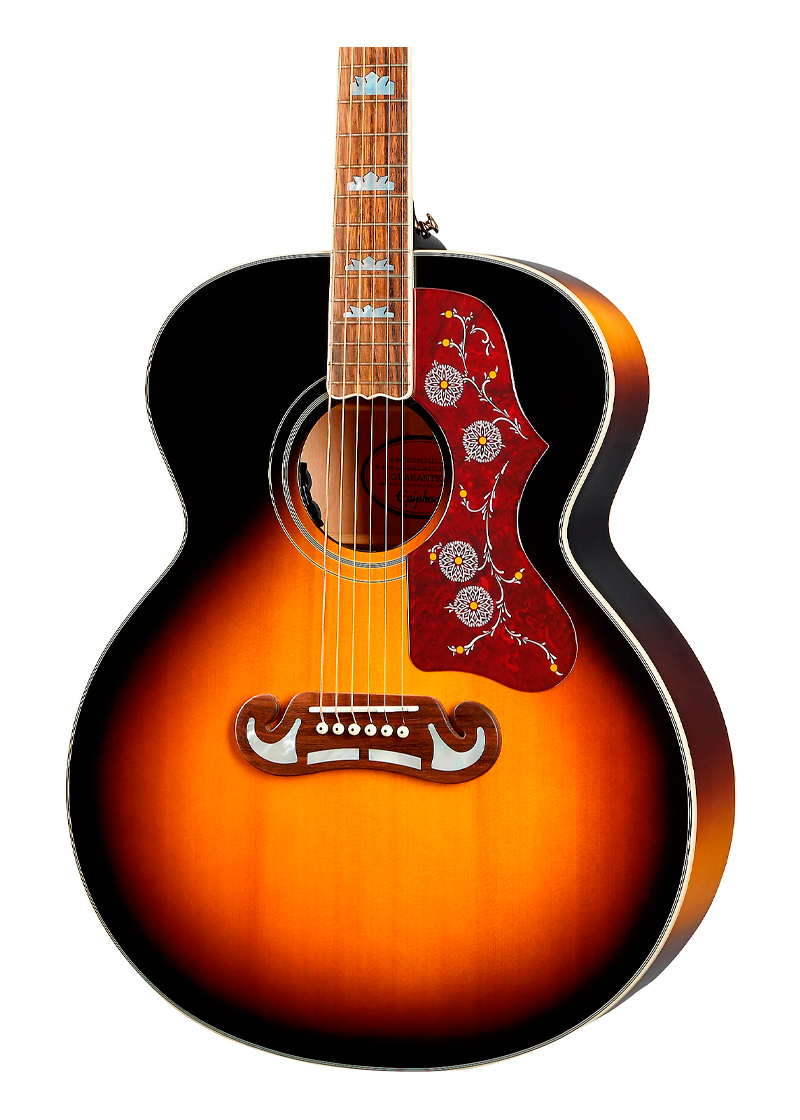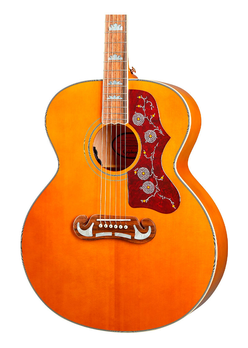 Epiphone equipó su guitarra electroacústica Inspired by Gibson J-200 con todo lo necesario. Es una guitarra completamente de madera maciza con fondo y aros de arce veteado y una tapa de abeto Sitka. El brillo vintage envejecido acentúa la veta debajo.