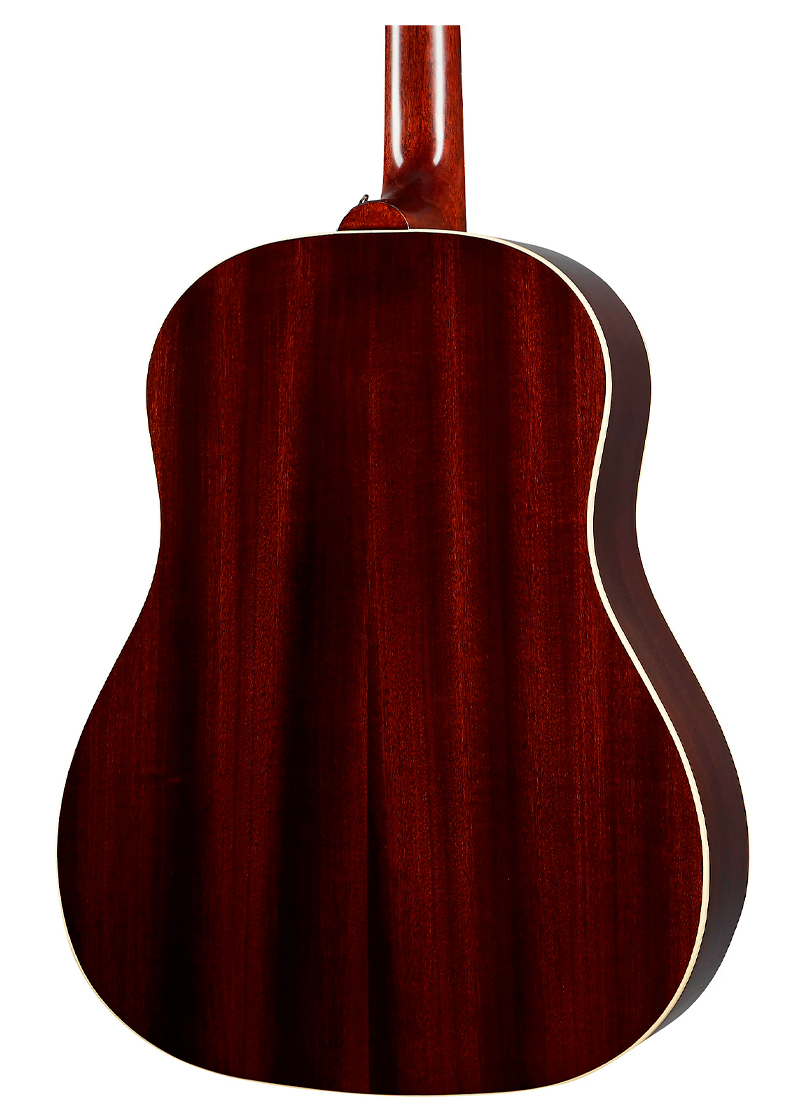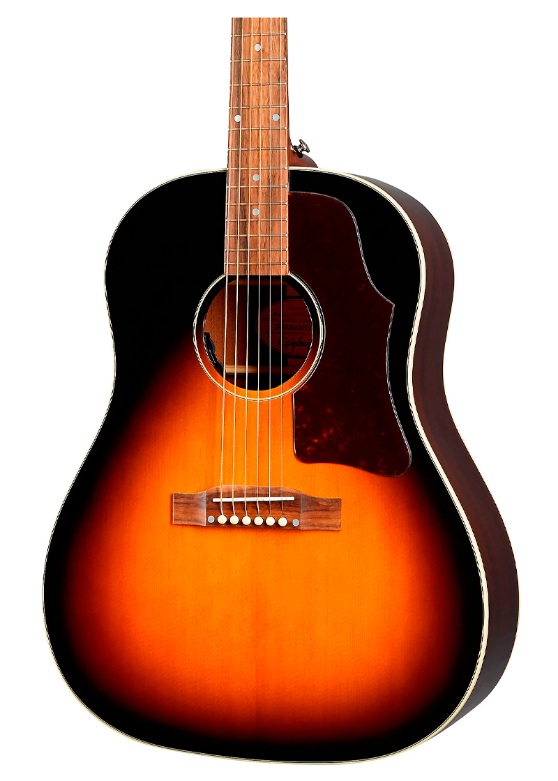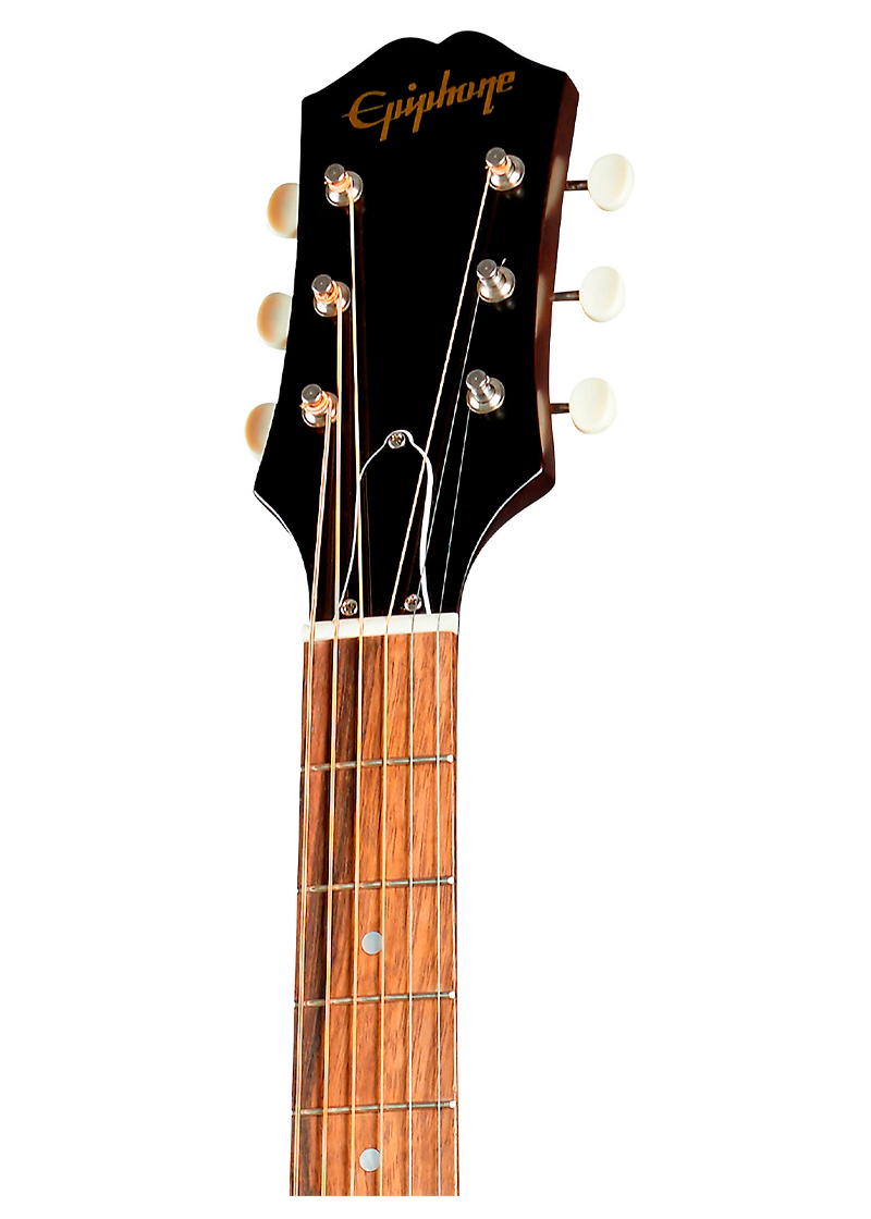 Epiphone especificó la guitarra electroacústica Inspired by Gibson J-45 con maderas completamente sólidas, combinando una tapa de abeto Sitka con fondo y aros de caoba. El acabado brillante vintage envejecido acentúa la veta debajo. El ribete de cuatro capas de marfil y negro delinea la tapa; la parte posterior se vuelve negra. Si te gusta aventurarte más allá de los acordes «vaqueros» de primera posición, el cutaway hace que sea fácil alcanzar las notas altas