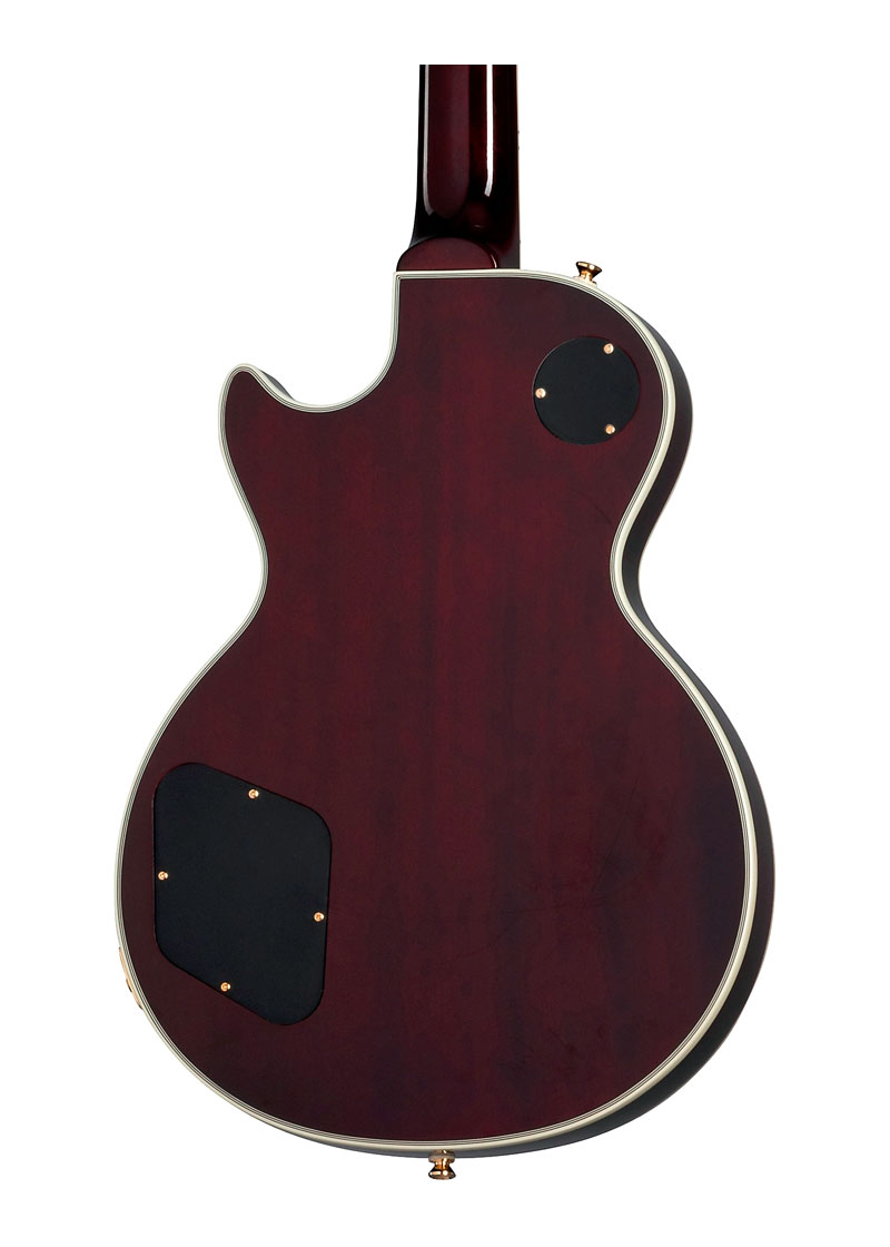 Inspirada en la icónica Les Paul Custom de Jerry Cantrell, la guitarra eléctrica Epiphone Jerry Cantrell Wino Les Paul Custom tiene muchos toques personales, que incluyen una tapa de arce liso y un cuerpo de caoba con alivio de peso de 9 orificios, herrajes dorados y clavijas de riñón Grover Rotomatic.