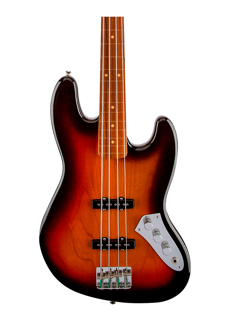 Fender Jaco Pastorius Fretless Jazz Bass Guitar 3-Color Sunburst en nuestra tienda de instrumentos musicales en Colombia, es un bajo eléctrico sin trastes diseñado en homenaje a uno de los músicos más influyentes de la historia del instrumento: Jaco Pastorius.