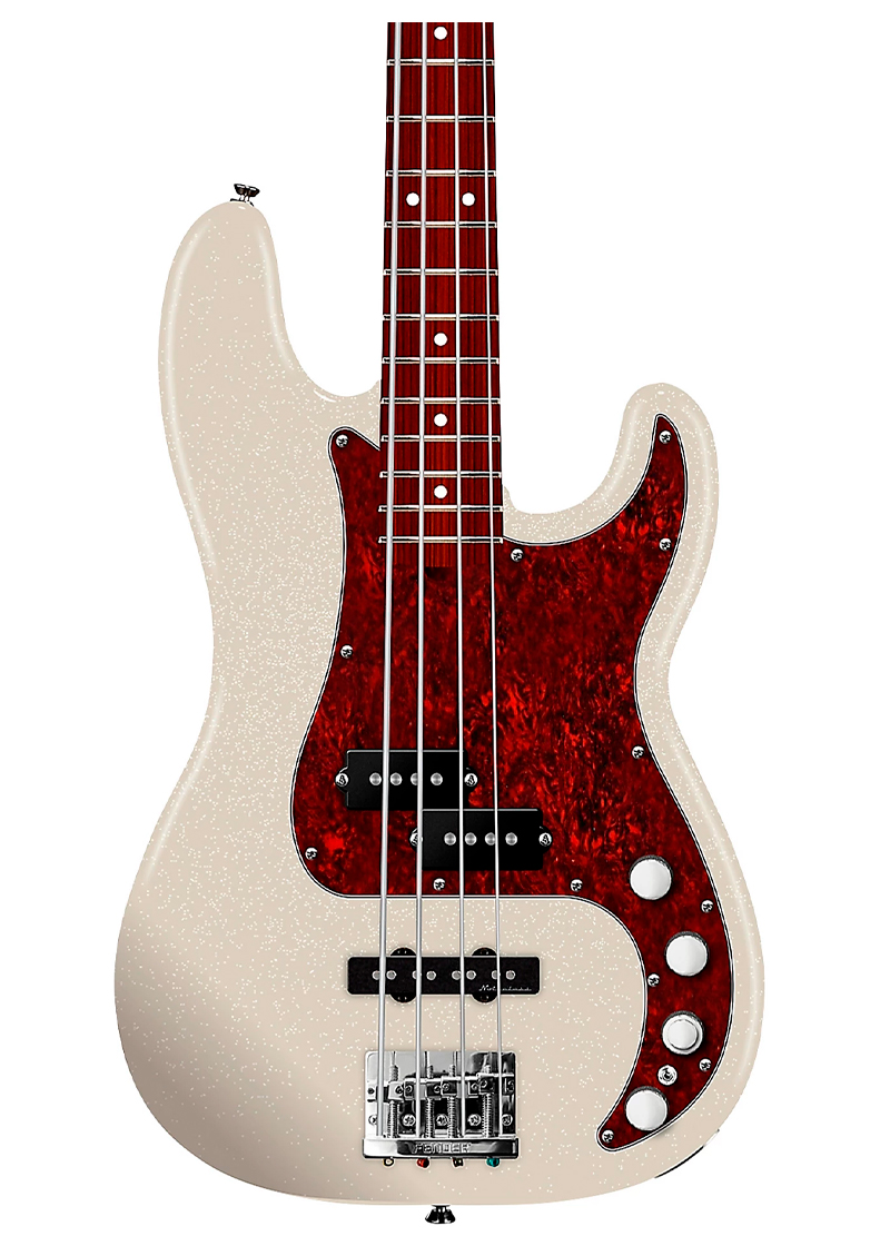 - Controles: Volumen maestro, potenciómetro panorámico, selector de pastillas, realce/corte de agudos, realce/corte de medios, realce/corte de graves, tono activo/pasivo, miniconmutador activo/pasivo