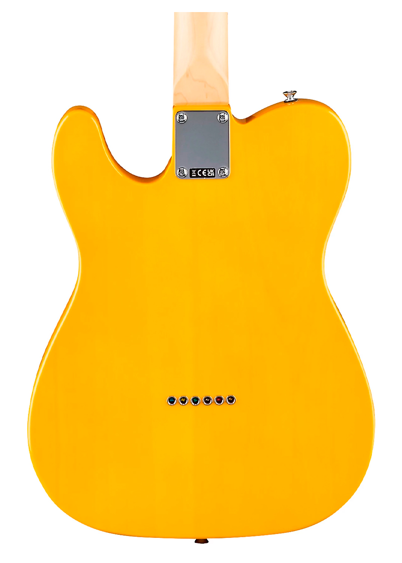 El cuerpo sólido tipo Telecaster ofrece estabilidad, sustain natural y comodidad en la ejecución. Su diseño minimalista la convierte en una herramienta confiable para músicos que buscan rendimiento sin complicaciones.