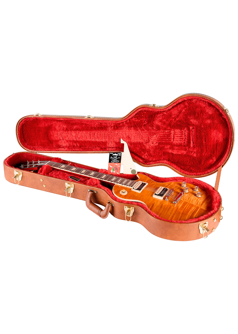 También incorpora las especificaciones favoritas de Slash de su propia colección de Vintage y Custom Shop Les Pauls, como un cuerpo de caoba maciza rematado con arce flameado AAA y un mástil de perfil grueso.