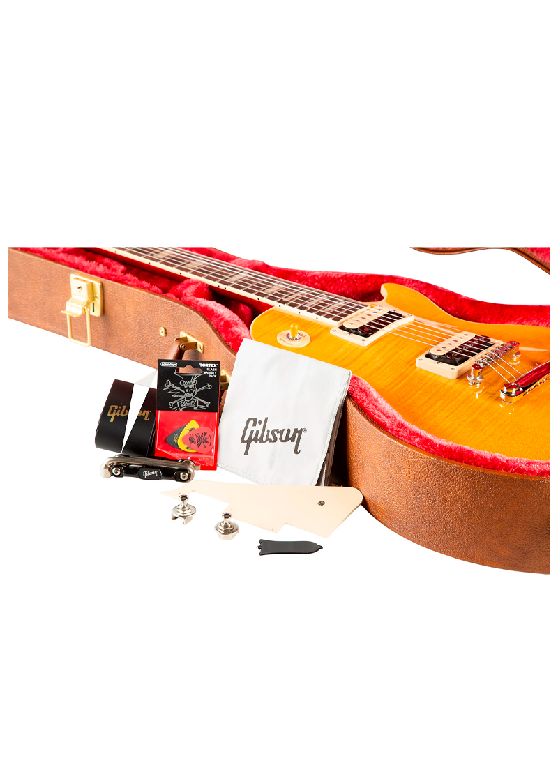 Otras especificaciones de alta calidad incluyen la firma de Slash en la cubierta del alma (también se incluye una cubierta en blanco), perillas de sombrero de copa e incrustaciones trapezoidales acrílicas. La Gibson Core Collection Les Paul Standard viene con las nuevas cuerdas Slash Ernie Ball, 4 púas Dunlop Tortex Slash y un estuche rígido de lujo.
