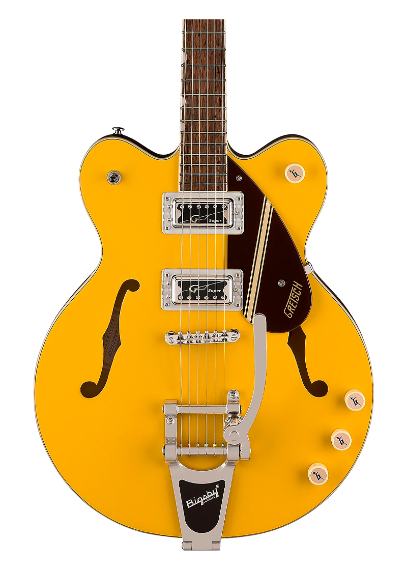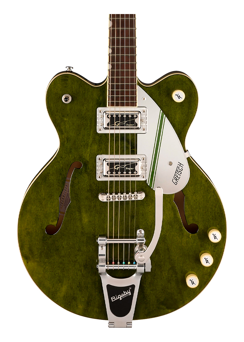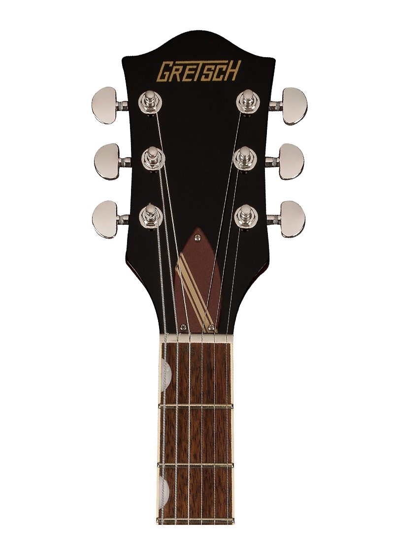 El sonido del G2604T es impulsado por un par de pastillas humbucking Super Hilo’Tron que brindan claridad y timbre mejorados. Su potencia sónica es aprovechada y moldeada por el conjunto de control tradicional. Controles de volumen de pastilla de mástil y puente, control de tono maestro, control de volumen maestro y conmutación de pastilla de tres vías. El estilo retro clásico está aquí con perillas de control de radio Gretsch G-Arrow, elegante ribete blanco envejecido con ribete negro y golpeador y alma de plexiglás. Cubierta con franjas Rally de estilo vintage. Combinando la estética vintage con características modernas de interpretación y rendimiento, el G2604T es un instrumento potente para cualquier guitarrista.
