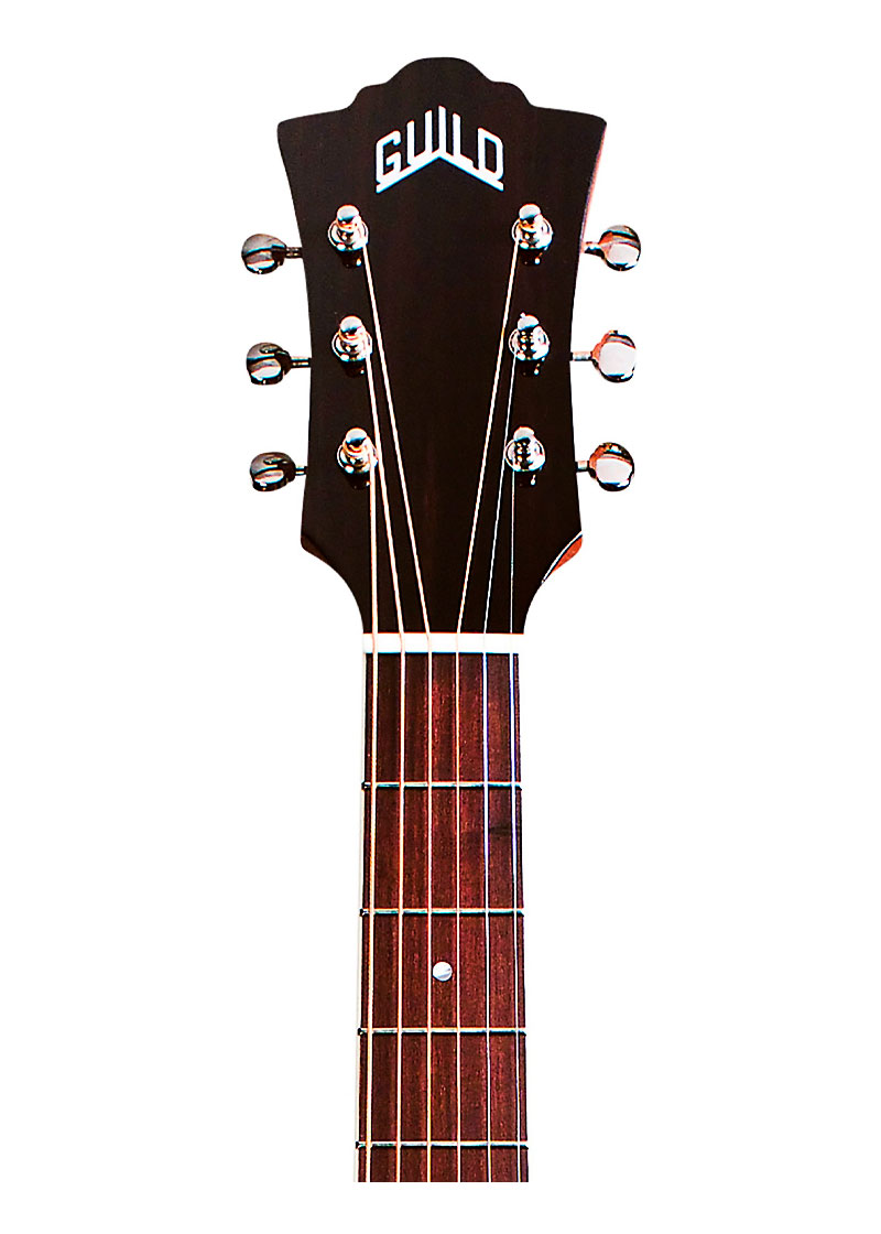 Los detalles premium incluyen una roseta de nácar, el logotipo de Guild Peak en el clavijero, el diapasón y el puente de pau ferro y la pastilla Fishman Sonitone con controles de volumen y tono.