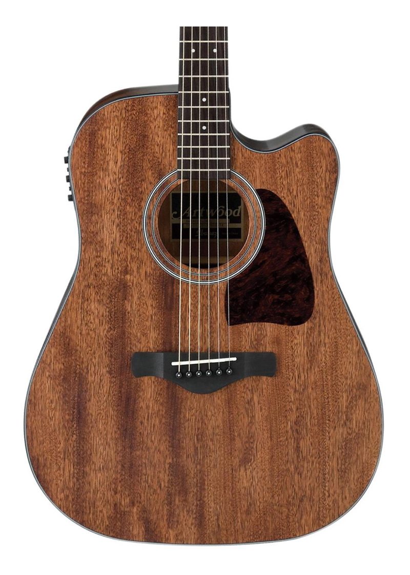 La guitarra acústica-eléctrica Ibanez Artwood AW54CEOPN dreadnought reúne la calidez del ocumé sólido con la innovadora electrónica Fishman para un instrumento que suena tan bien desconectado como amplificado. Ibanez diseñó la serie Artwood para honrar su historia en la fabricación de guitarras acústicas al tiempo que incorpora las características que exigen los guitarristas modernos. El acabado natural de poro abierto del AW54CEOPN muestra la hermosa veta de la madera de caoba y se complementa con un golpeador de tortuga, clavijas de fundición cromadas y una roseta en blanco y negro.