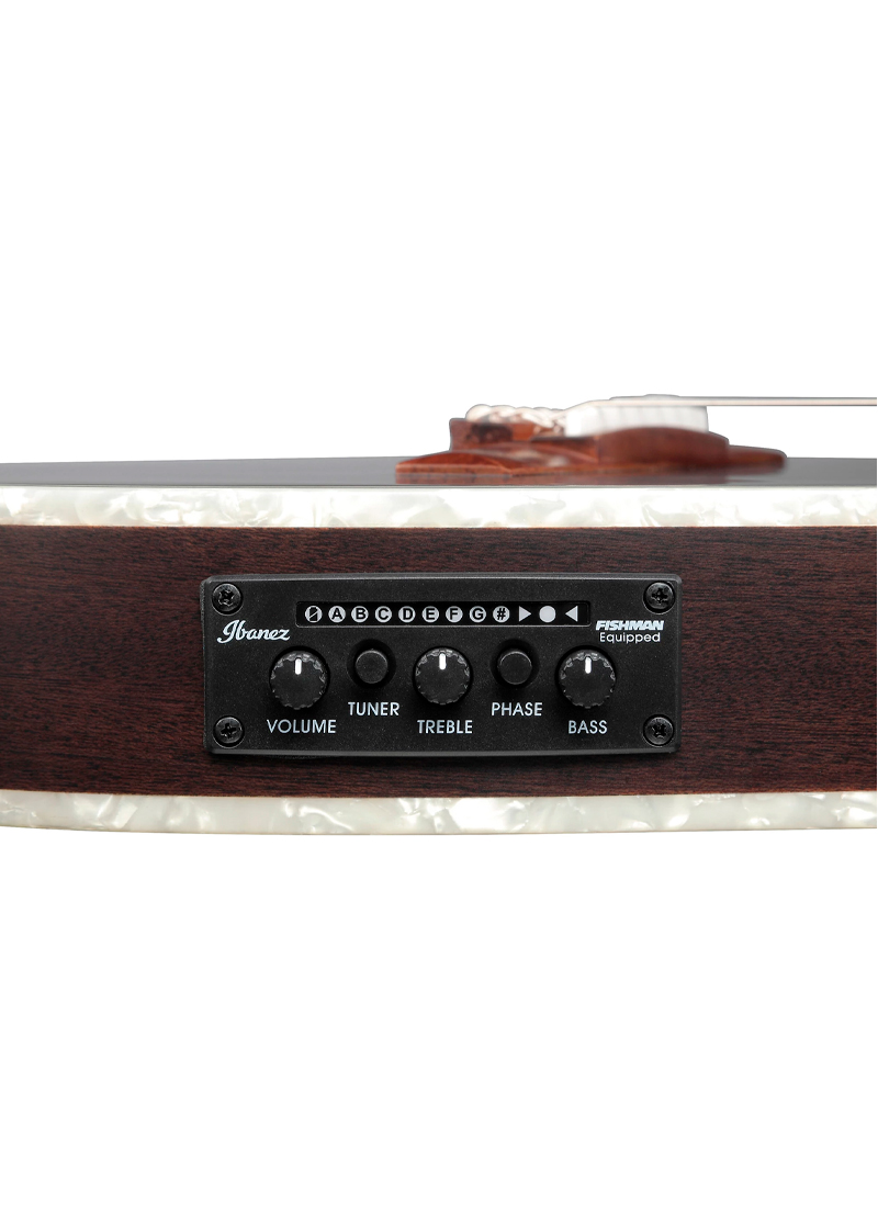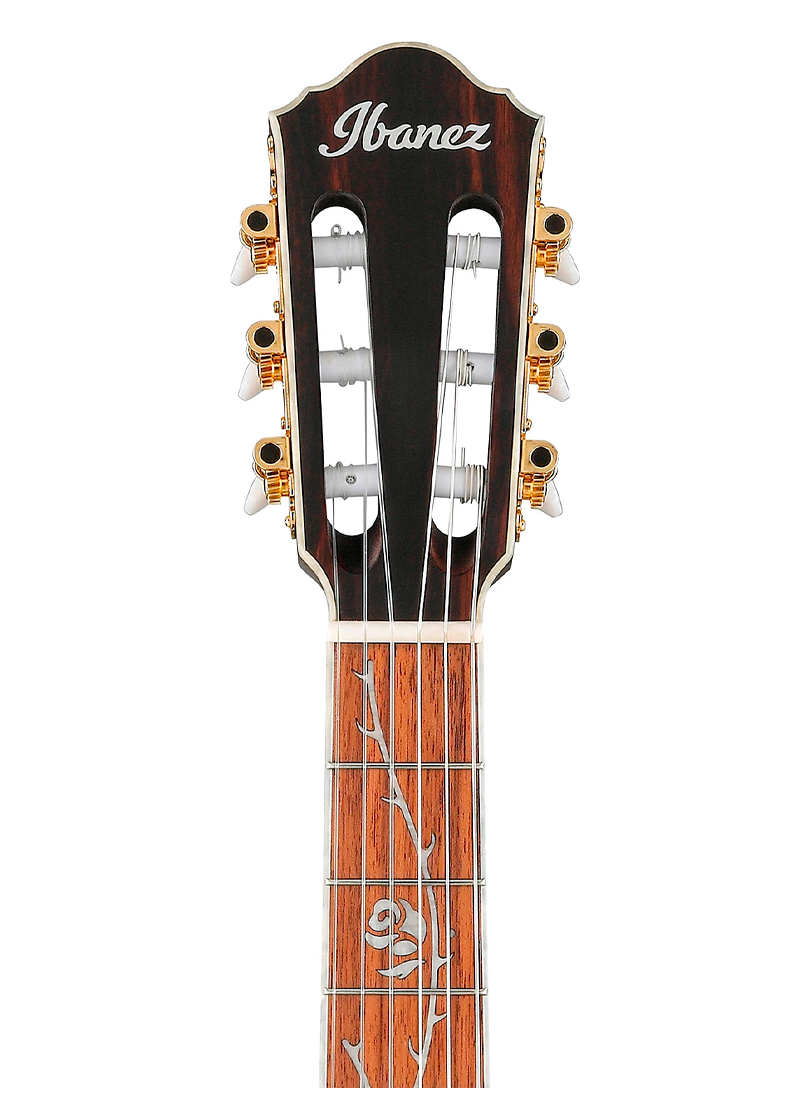 El mástil fino de nyatoh y el ancho de cejuela de 46 mm hacen que tocar acordes y melodías sea muy fácil, mientras que la incrustación del árbol de la muerte es un guiño al icónico diseño del árbol de la vida de Ibanez, con un toque vanguardista.