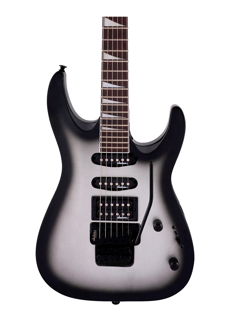 Este instrumento también cuenta con controles de volumen y tono único, selector de 5 posiciones y un puente de trémolo de doble bloqueo Floyd Rose de la marca Jackson para mejorar el tono y el sostenido.