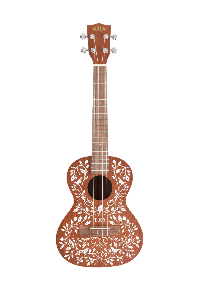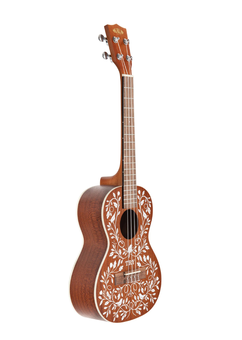 El ukelele tenor Learn To Play Signature Series de Mandy Harvey está hecho de caoba satinada e incluye encuadernación blanca y obras de arte originales que recuerdan al arte popular suizo del siglo XIX. El delicado patrón de enredadera con pájaros y flores fue creado por la hermana de Mandy, lo que lo convierte en una obra de arte muy personal y única.